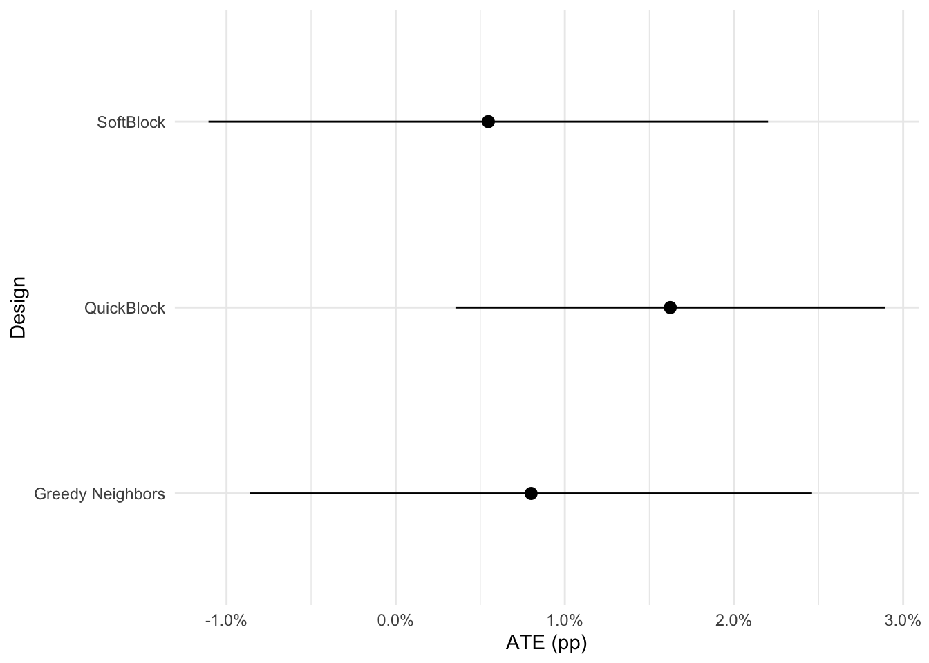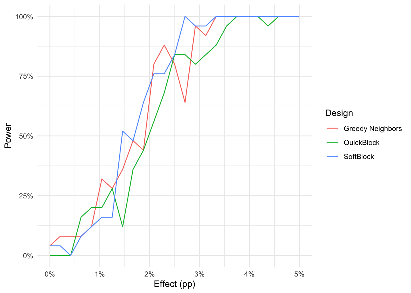 design=c(rep('SoftBlock', length(power_sb)), rep('Greedy Neighbors', length(power_sb)), rep('QuickBlock', length(power_sb)))